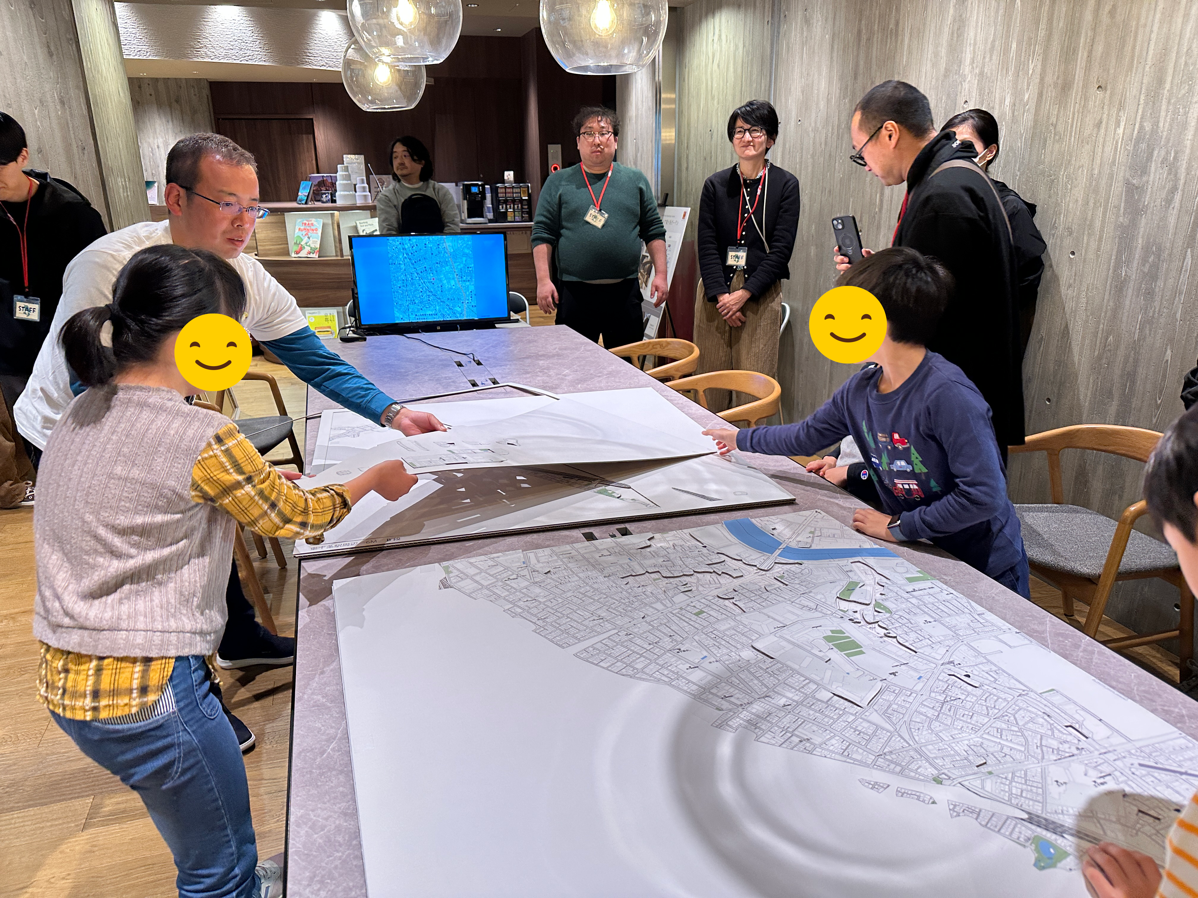 ワークショップではジオラマを組み立てて地形の特徴を確認したあと、水害リスクを中心に皆で話し合いました。荒川の下流域にあるため、流域単位の長時間での視点で状況を判断する必要があることなども、気象予報士のメンバーからお話ししました。
